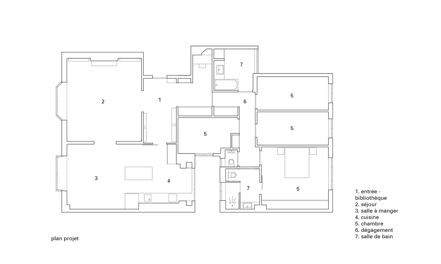 Le plan suit la logique de la distribution d’avant, avec la partie nocturne d’un côté et les espaces de réception de l’autre. Par contre, les pièces intermédiaires ou les espaces de connexion, changent de statut et deviennent de vrais espaces à vivre ; le hall d’entrée devient une bibliothèque et le premier dégagement un espace de bureau.